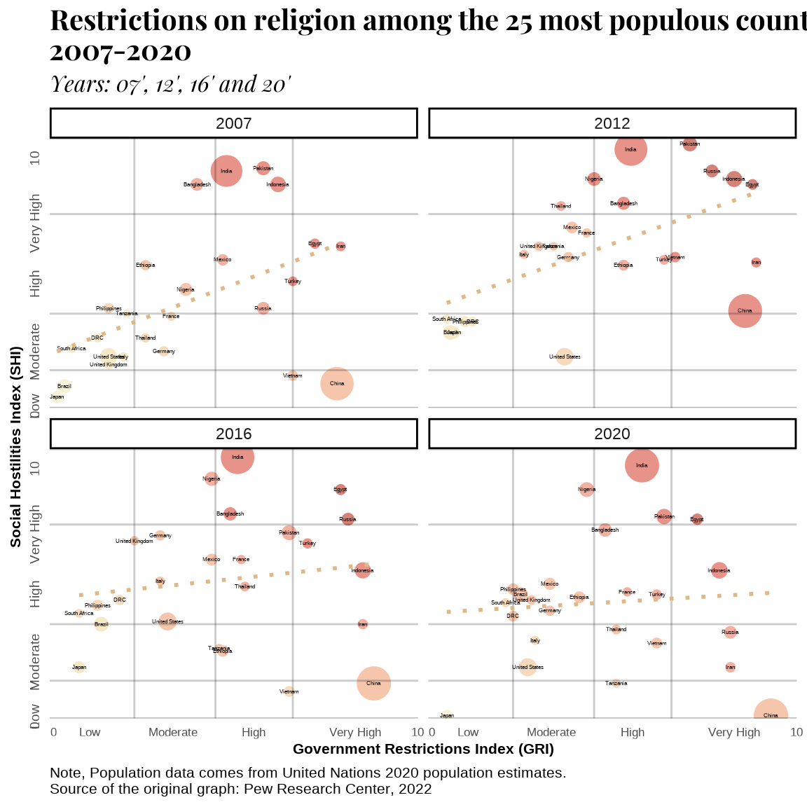 A replication of a graph from Pew Research Center on the restrictions on religion among the 25 most populous countries.