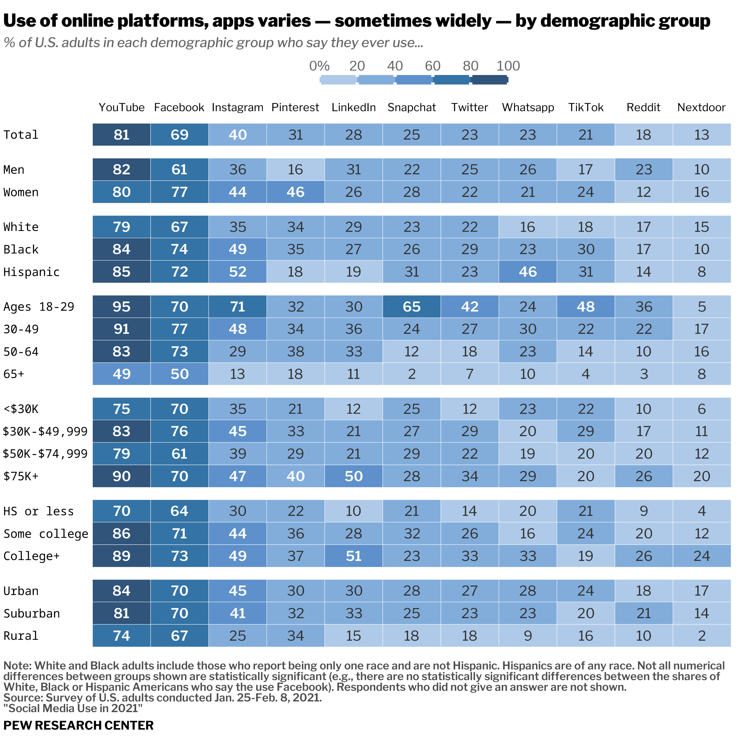 Replication and alternative version of a heatmap from 'Social Media Use in 2021' (Pew Research Center).