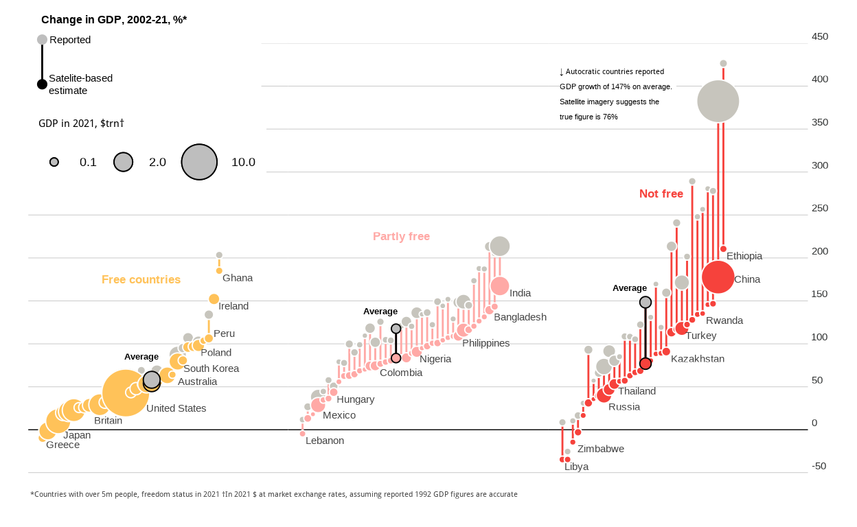 Highly customized dumbbell chart that compares official GDP against satellite-based estimation of GDP, across 103 countries.
