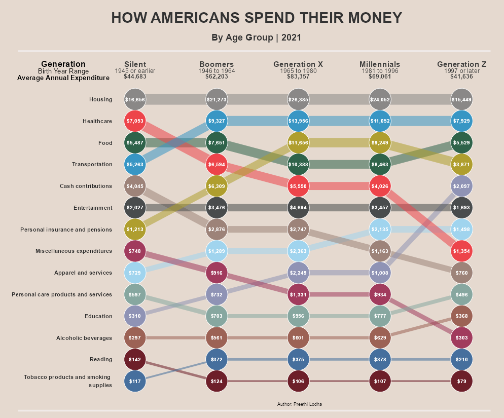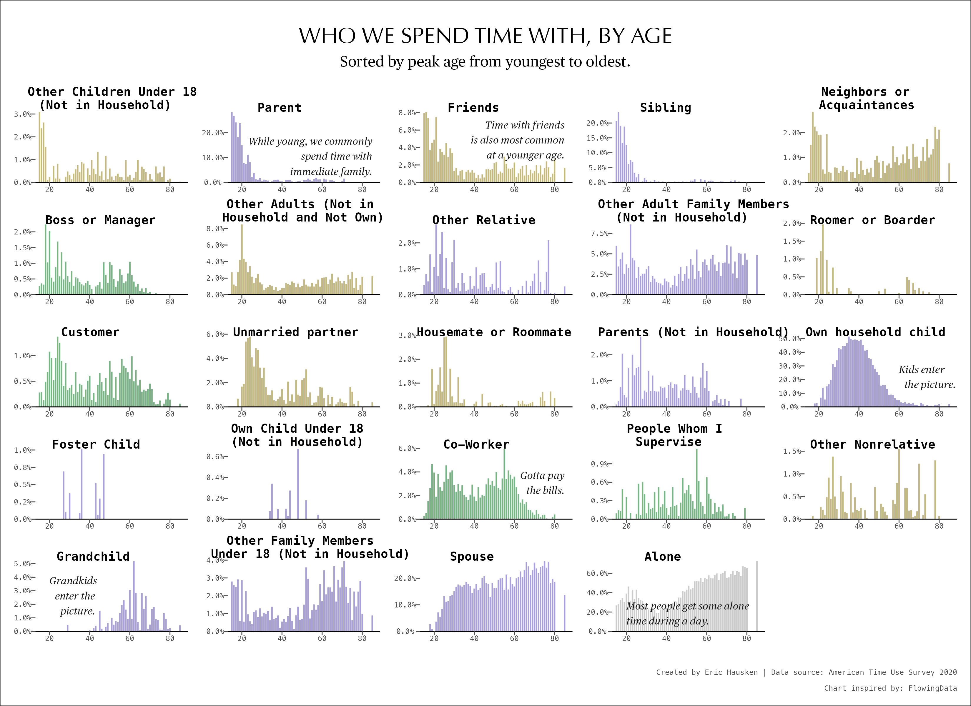 This article goes through the steps of recreating a bar chart with small multiples using the ggplot2 package in R. The original chart shows the distributions, by age, with whom we spend our time. The replication and enhanced versions include new data from the year 2020.