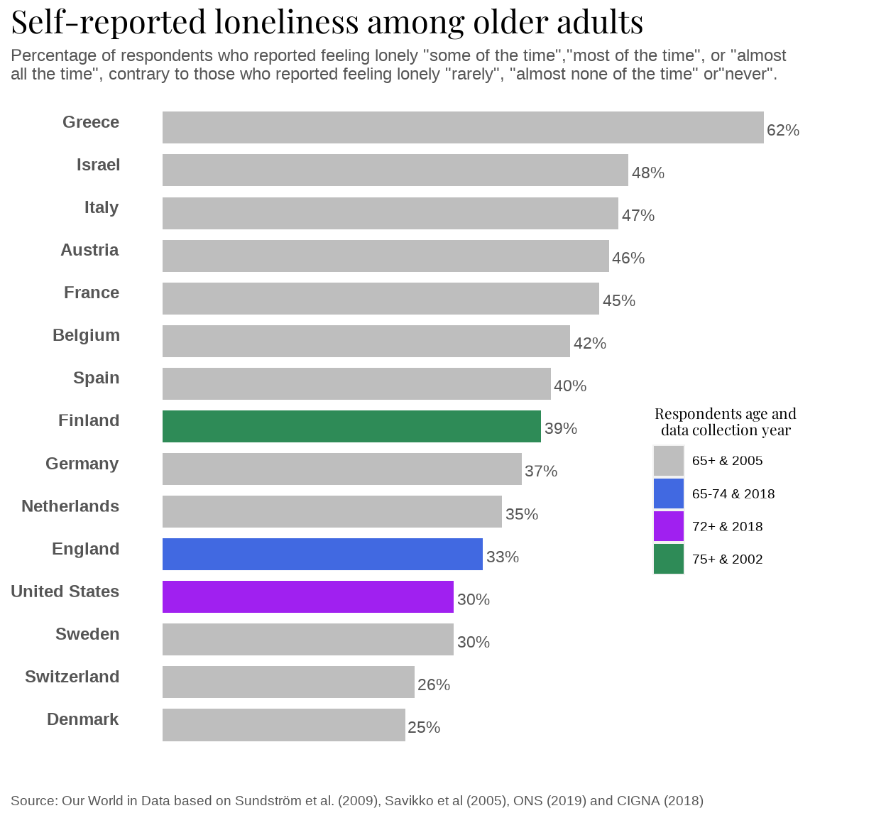 Visualizing and comparing loneliness percentage among elders between different countries, through barplots and maps.