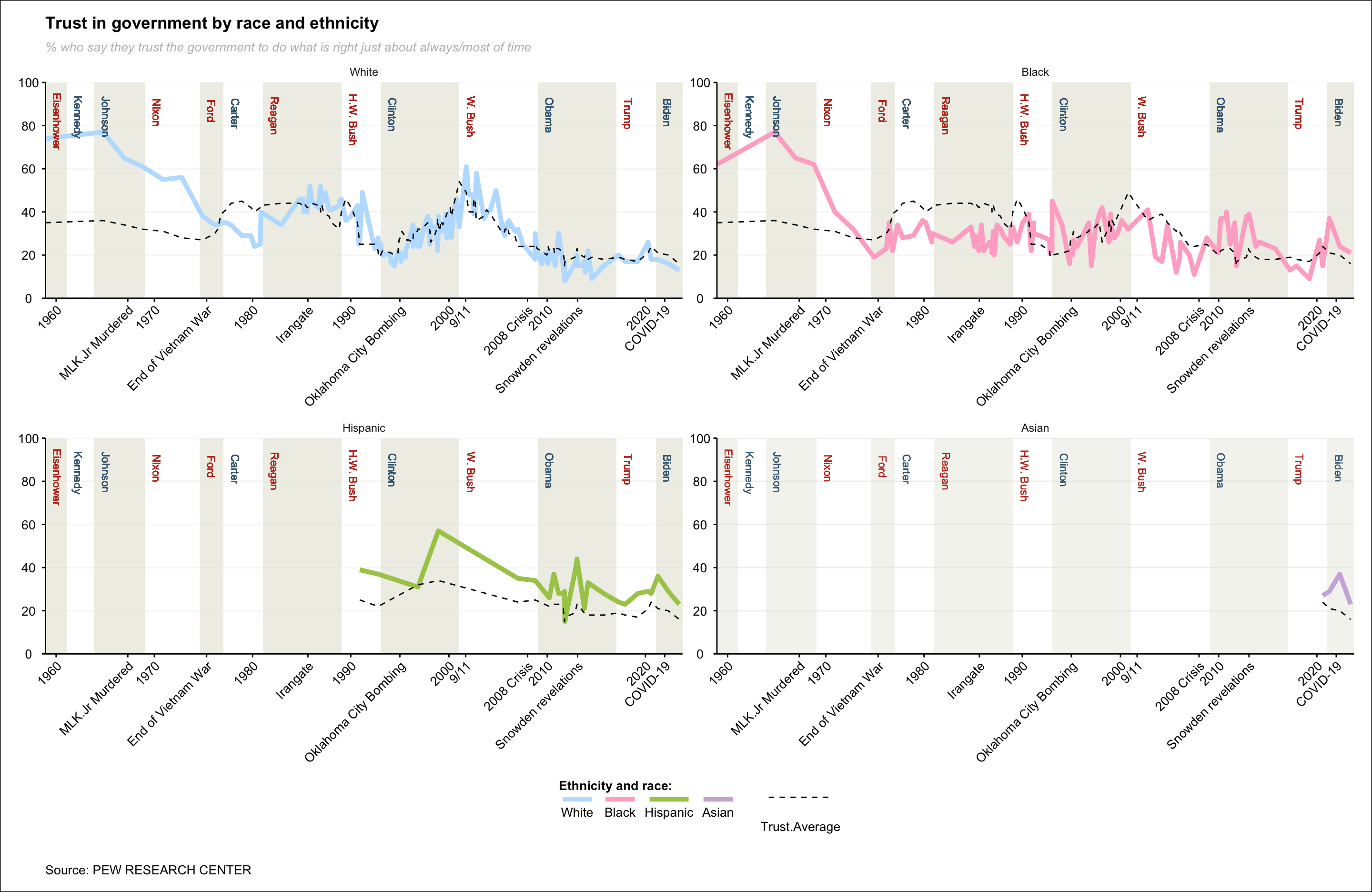 Visual representation of the evolution of public trust in the United States government by race and ethnicity from 1958 to 2023, as documented in the Pew Research Paper.