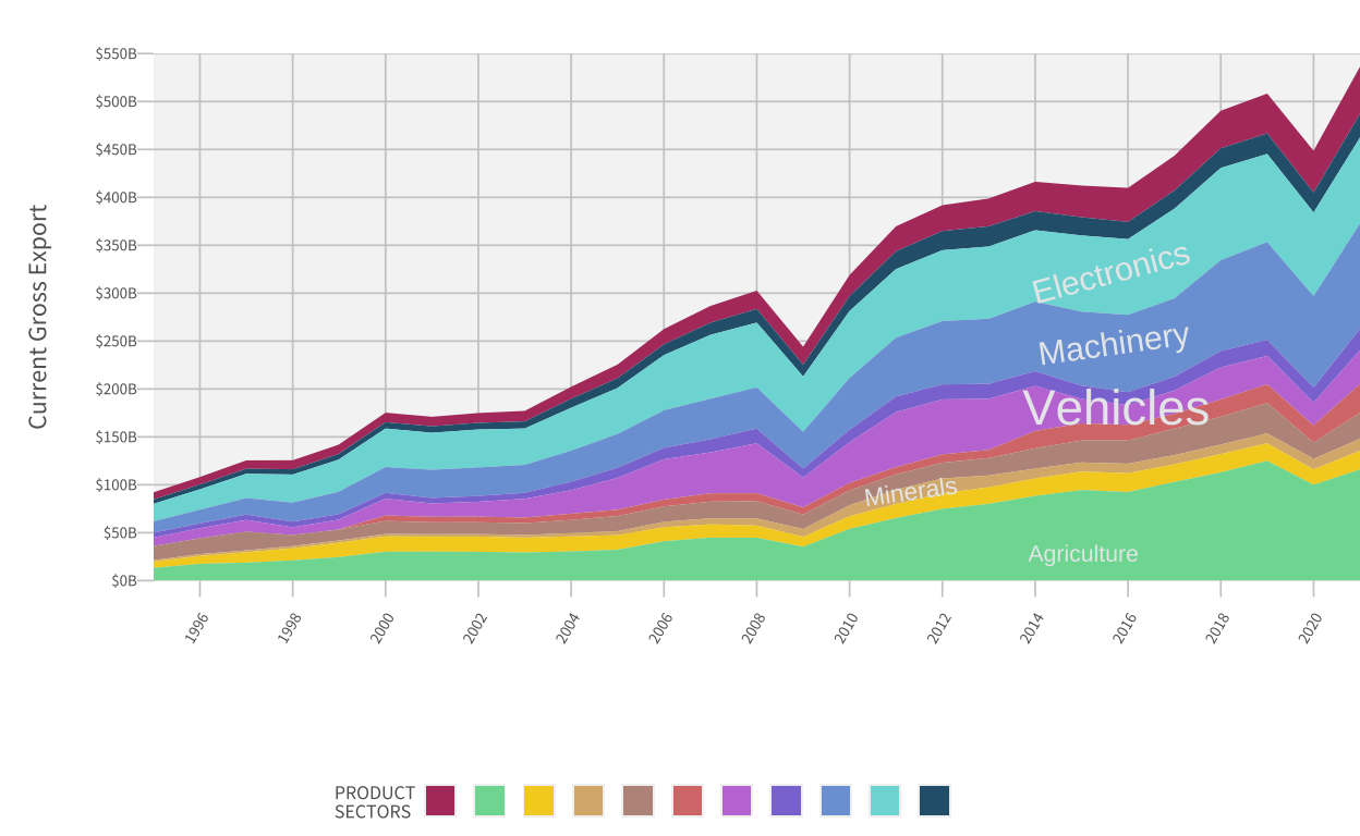 Replication and alternative version of the over time graph sector exports of Mexico by the Growth Lab at Harvard University.