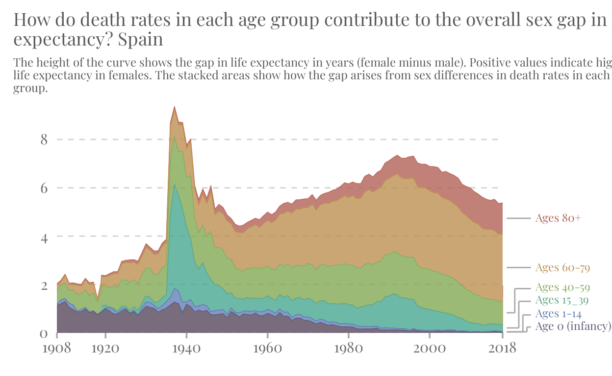 How many more years do Spanish women live compared to men? This project replicates and enhaces a World in Data graph showing the evolution of the sex gap in life expectancy from 1908 to 2018 in Spain.