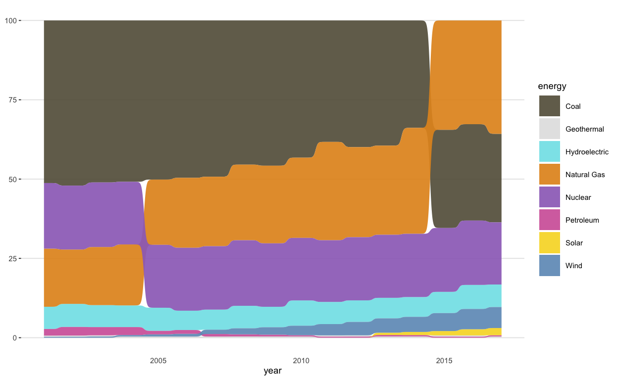 This graph describes how the sources of electricity generation in the United States have changed from 2001 to 2017.