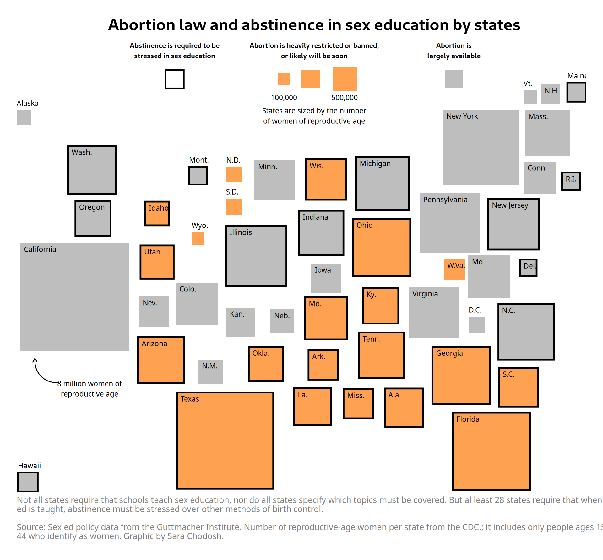 Below is an analysis and replication of the graph by Sara Chodosh, originally published in The New York Times, which examines the relationship between abstinence-focused sex education requirements and abortion access restrictions across U.S. states.