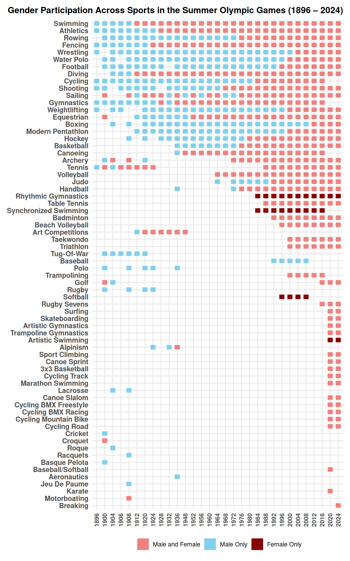 Recreation, improvement and alternative visualizations of gender participation in the Olympics plot (1896 – 2024).