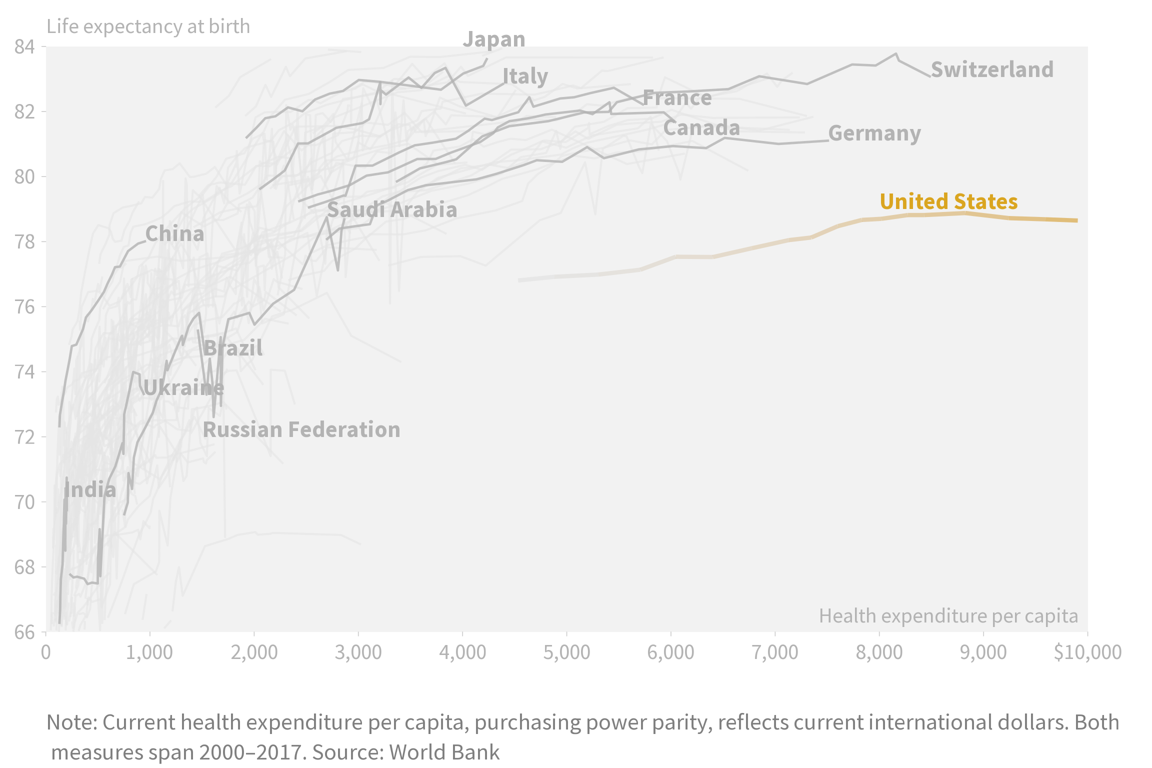 An exploration of how health spending correlates with life expectancy across countries from 2000 to 2017, recreated and refined from an original New York Times graphic.