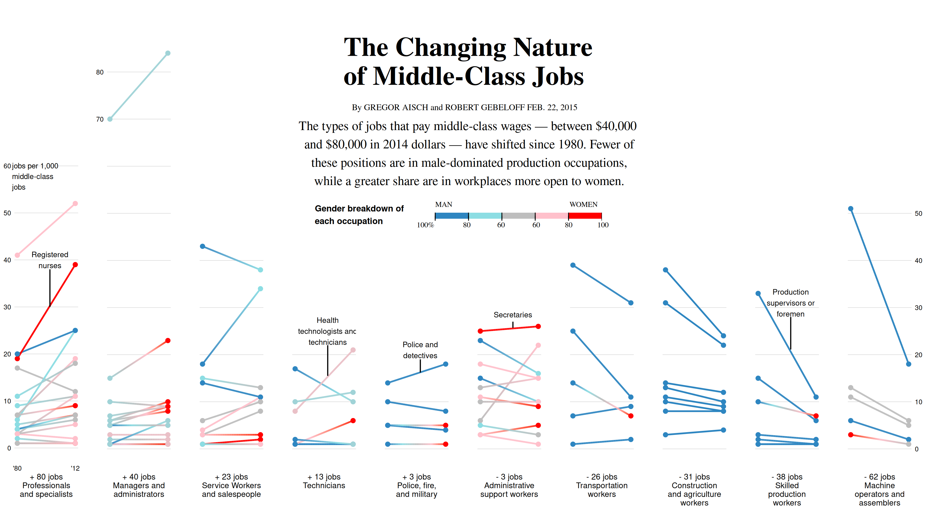 The types of jobs that pay middle-class wages — between $40,000 and $80,000 in 2014 dollars — have shifted since 1980. Fewer of these positions are in male-dominated production occupations, while a greater share are in workplaces more open to women.
