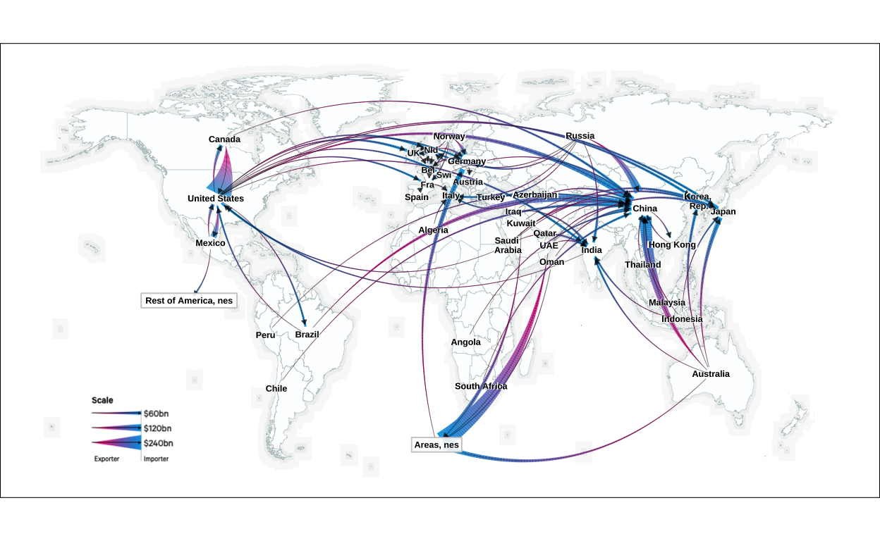 Using UN Comtrade trade data of 2022 to reproduce the resourcetrade.earth world map and produce an alternative network graph.