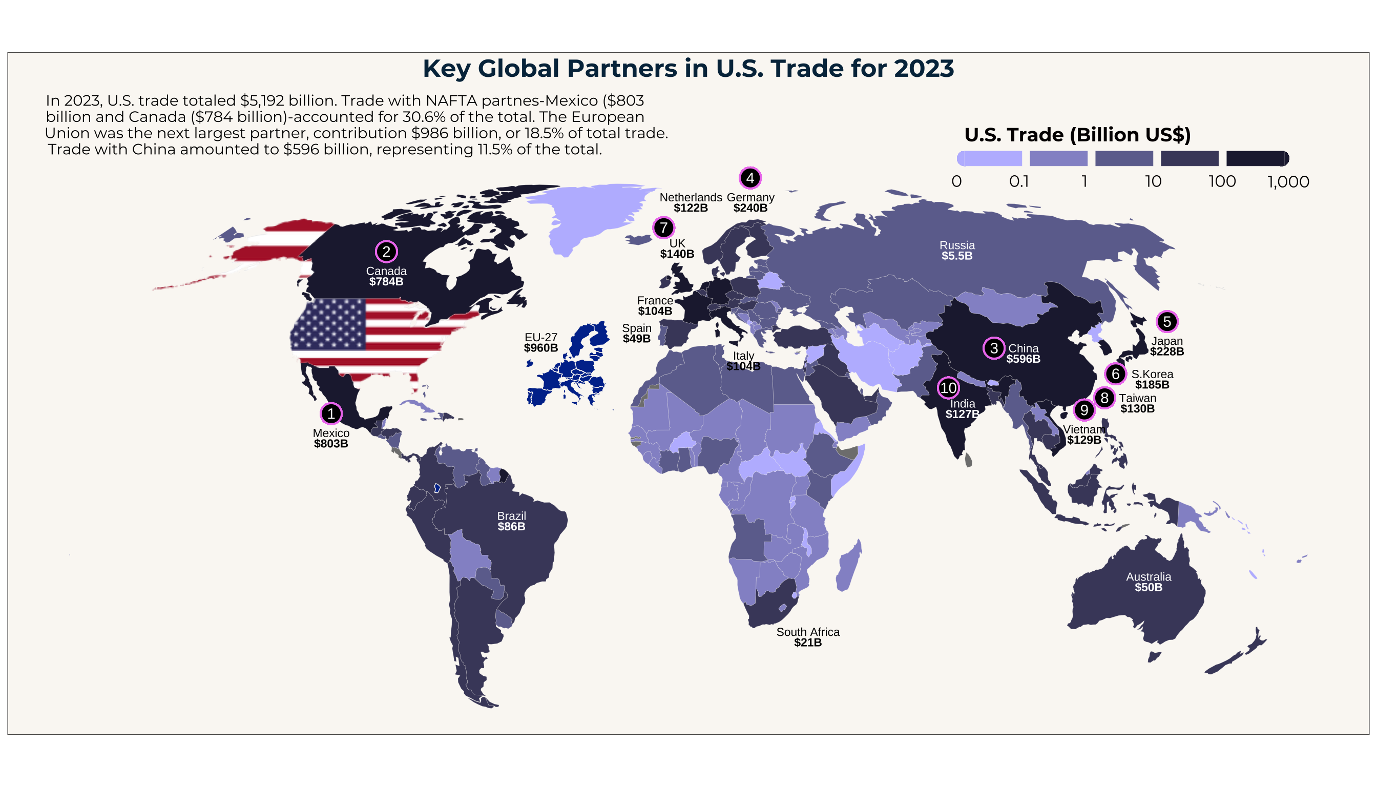 Worldwide U.S. Trade in Billions by country in 2023